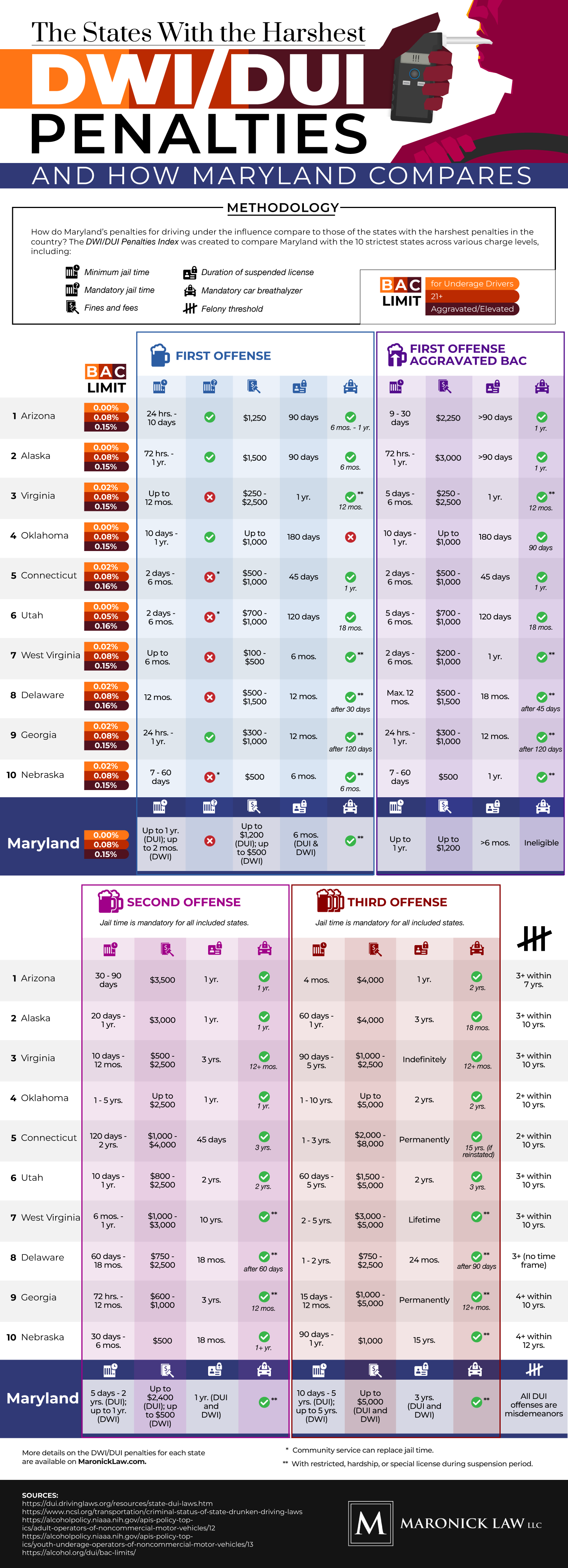 Maryland's approach raises questions about its effectiveness in deterring repeat offenses and balancing punishment with prevention compared to stricter states. To shed light on this, Maronick Law LLC has reviewed the states with the most severe penalties to see how they compare to Maryland’s approach.